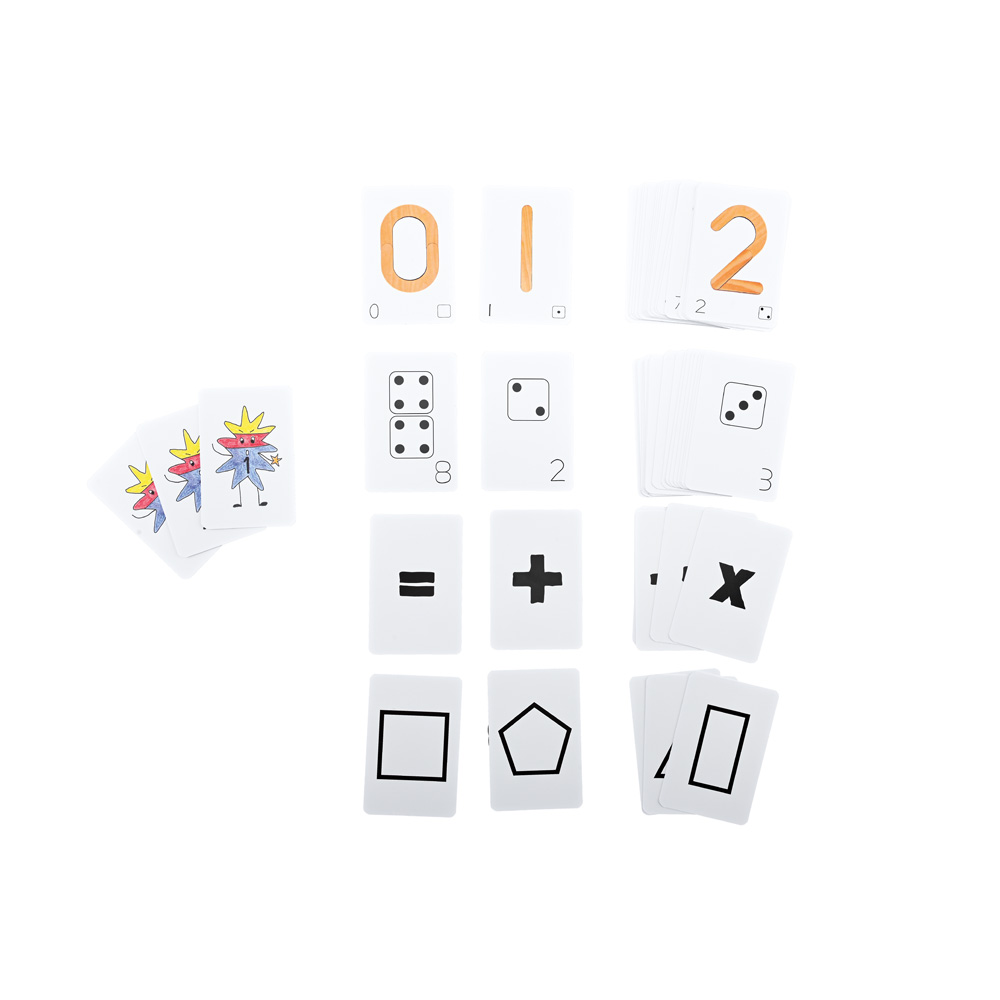 • 20 Spielkarten mit Zahlen, 20 mit Augenzahlen, 7 mit Rechenzeichen, 5 mit geometrischen Figuren und 3 mit Monstern