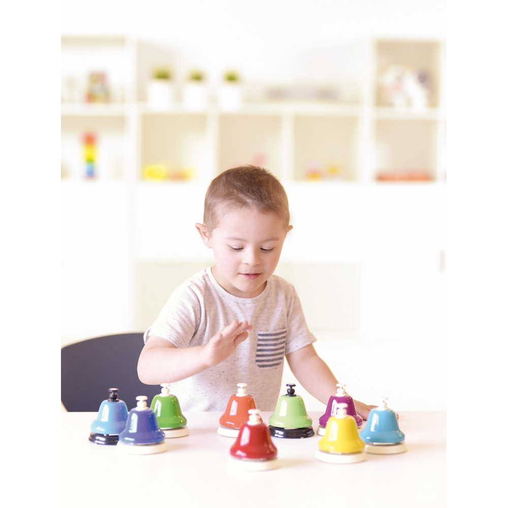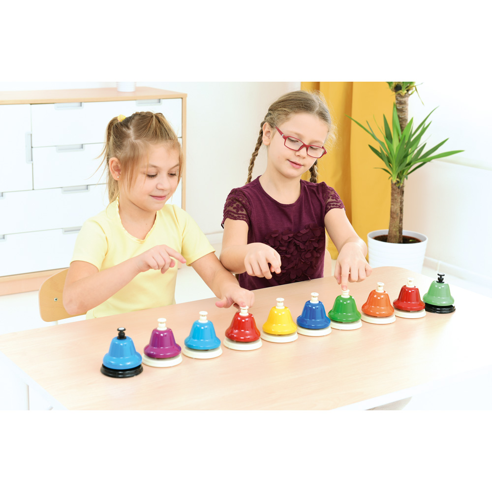 Durch Knopfdruck erklingen verschiedene Töne; Tonumfang 1 Oktave (c-c). Klarer Klang; standfest, aus stabilem Metall.