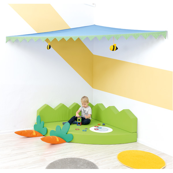 Farbenfrohe Spielecke mit niedlichen Applikationen, erhältlich in 2 Versionen - Unterwasserwelt und Karottenfeld. Aus 2 Teilen: Spielmatte mit Wandlehne (101425, 101426) und Baldachin (101423, 101424, 101982) - jeweils separat zu bestellen. Sie schaffen einen ruhigen Ort, an dem sich jedes Kind geborgen fühlt. Hier kann man nicht nur spielen, sondern auch den Tastsinn trainieren oder sich einfach vom Alltagstrubel zurückziehen.