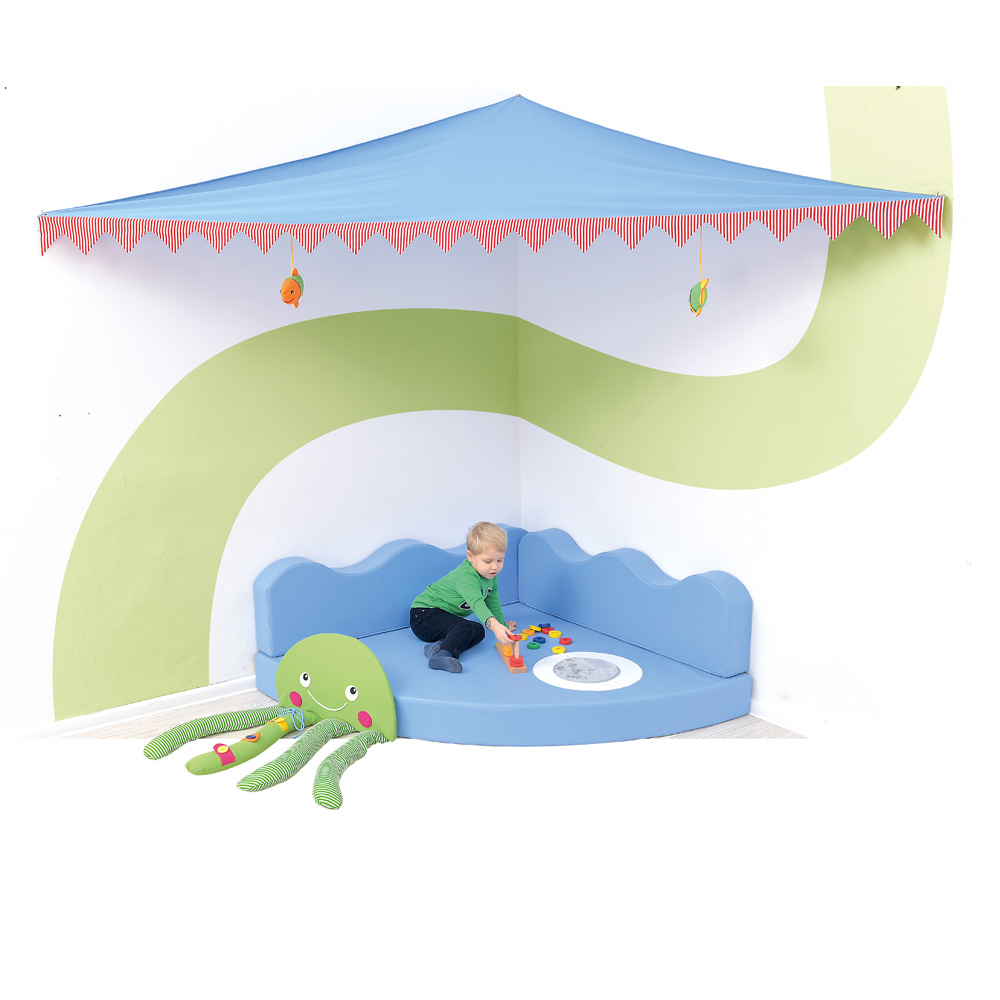 Unter dem Eckbaldachin lässt sich eine Sensorikecke einrichten: mit unserem dreieckigen Ballbad inkl. Bälle (101778, 101827, online bestellbar) und mit funkelndem Lichtleiter-Vorhang (separat bestellbar).