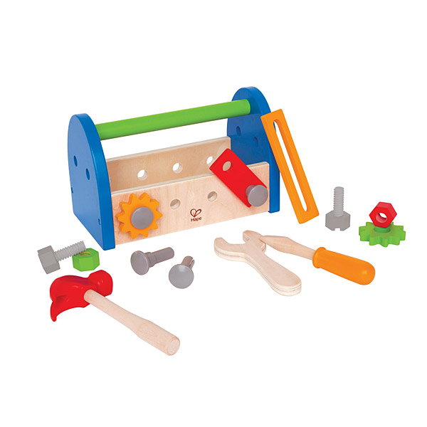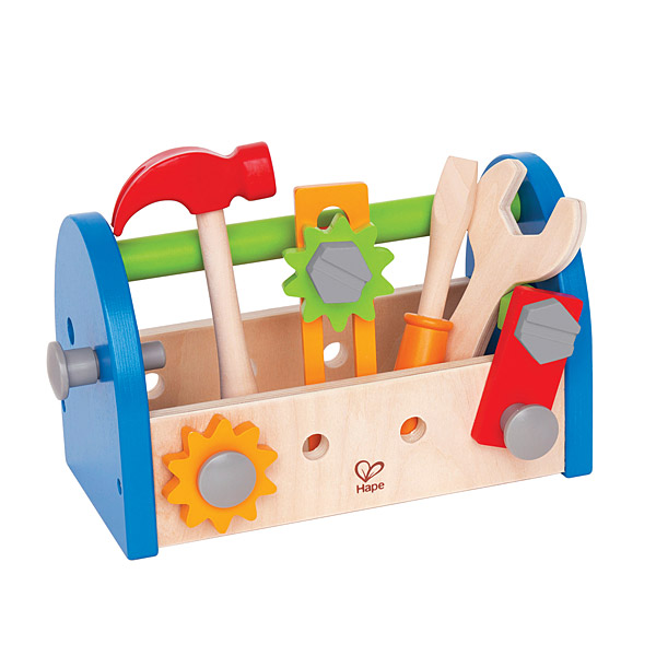 Er enthält Werkzeuge und ist eine Hilfe für den kleinen Konstrukteur; Einzelteile werden zusammen- und auseinander geschraubt; Werkzeugkasten aus Holz gefertigt.