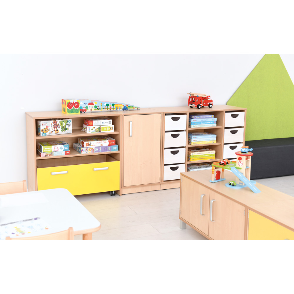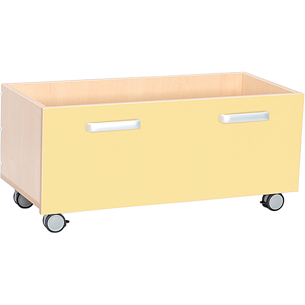 Eine praktische Variante zum Aufbewahren; Rollen erleichtern den Transport. Aus laminierter Spanplatte (Stärke 18mm) in Birke-Dekor, mit ABS-Kante (Stärke 2mm) in Multiplex-Optik mit Elementenaus melaminbeschichteter Spanplatte.
