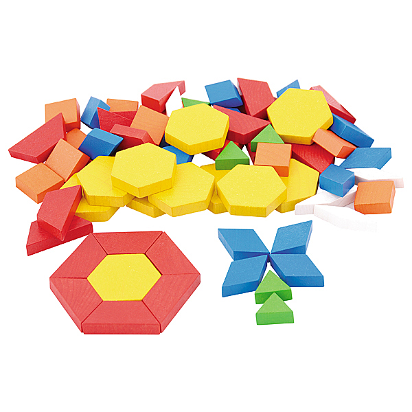 Bunte Legesteine in verschiedenen geometrischen Formen und Farben, aus denen sich fantasievolle Bilder legen lassen, frei nach eigener Vorstellung oder nach Mustervorlagen (500020 - separat bestellbar).