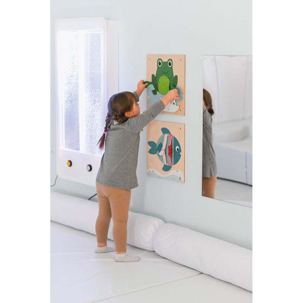 Dekorative Elemente aus Sperrholz mit einer Vielzahl von Motiven, die Kinder zum Spielen, Beobachten und Berühren anregen; Oberflächen können erforscht und Verschlüsse betätigt werden; Montagematerial inklusive; an der Wand zu befestigen (einzeln oder paarweise in einem Rahmen); Rahmen zur Wandmontage (118252) separat bestellbar.