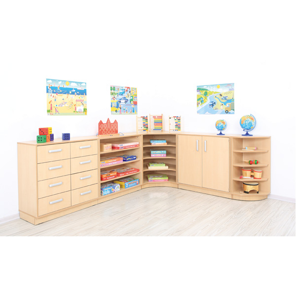 Zur Aufstellung der Flexi-Kollektion über Eck; fünfeckige Grundfläche, schräge Seitenteile geschlossen. Aus laminierter Spanplatte (Stärke 18 mm) in Birke-Dekor, mit ABS-Kante (Stärke 2 mm) in Multiplex-Optik. • Masse: Seitenwände: je B 41,5 cm • Rückwände: je B 80 cm • Höhe: H 87,1 cm (Gesamthöhe angegeben inkl. Sockelbereich von 8 cm)