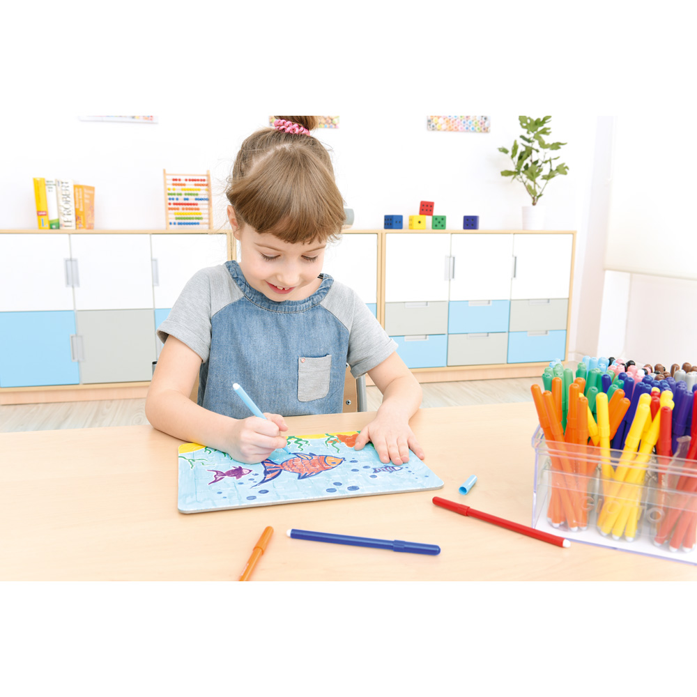 Stifte mit extra robuster Spitze; ventilierte Kappe; giftstofffreie Tinte auf Wasserbasis; leicht von der Haut und aus Textilien zu entfernen.