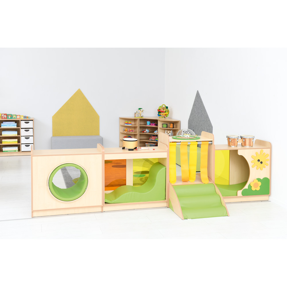 Ein Schrank als Abenteuerspielplatz oder Rückzugsort vom Kitatrubel. Die Matten laden zum Ausruhen ein. Hier kann man in Ruhe in einem Buch schmökern. Bequem und entspannend.
