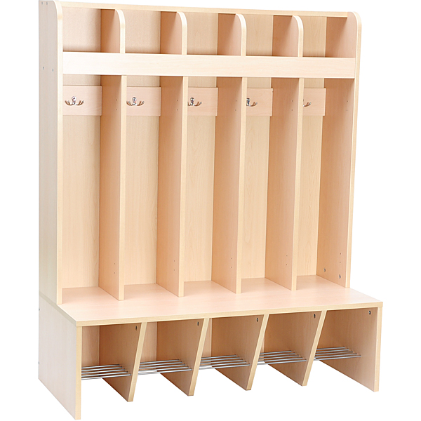 Die Garderoben sind schmal, ähnlich einem Spind, mit 3 oder 5 Fächern; aus laminierter Spanplatte in Ahorn-Optik. Passende farbige Türen (einzeln 100052-100057; 100830, 100955, 096218-096220, 096623, 094234-094241 oder als Set 100834, 100835 098432, 098433) sind separat bestellbar (Vorbohrungen für Scharniere befinden sich rechtsseitig). Im Oberteil befindet sich eine Querleiste zum Anbringen von Namens- oder Symbolschildern. Jedes Fach hat einen Doppelhaken für Bekleidung. Das Unterteil dient als Schuhablage mit Gitterrost. Erhältlich in 2 Sitzhöhen: 26 cm und 32,5 cm