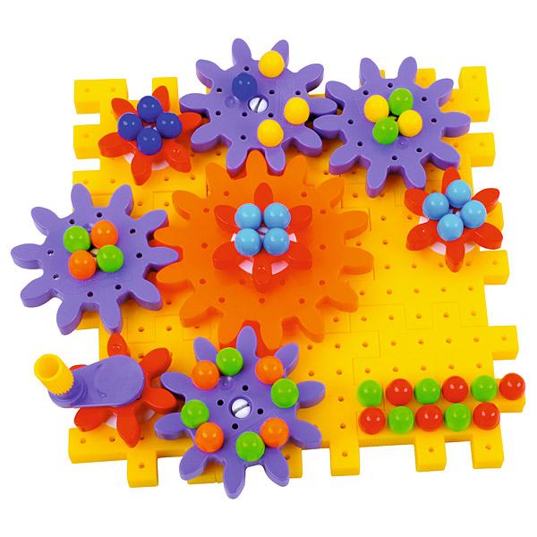 Aus Zahnrädern und jeder Menge Zubehör werden auf den Steckplatten die tollsten 2- und 3-dimensionalen Konstruktionen zusammengebaut. Die selbst erschaffenen Maschinen lassen sich per Kurbel tatsächlich in Bewegung setzen. So lernen die Kinder das Antriebsprinzip von Fahrrad und Co., andere einfache mechanische Abläufe sowie das Prinzip von Ursache und Wirkung verstehen. Fördert die Kreativität - die Kinder können nach Anleitung bauen oder aber die verschiedenfarbigen Teile selbst kombinieren. Alle Teile sind aus weichem Plastik; unzerbrechlich und abwaschbar; mit abgerundeten Ecken, um höchste Sicherheit zu garantieren.