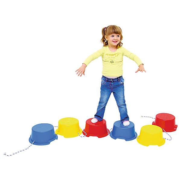6 bunte "Steine" aus strapazierfähigem Kunststoff, verbunden mit einem verstellbaren Seil. Die "Steinoberfläche" mit Antirutsch-Struktur stimuliert die Fusssensorik; eine gute Gleichgewichts- und Koordinationsübung.