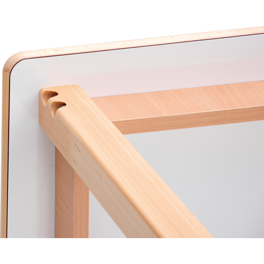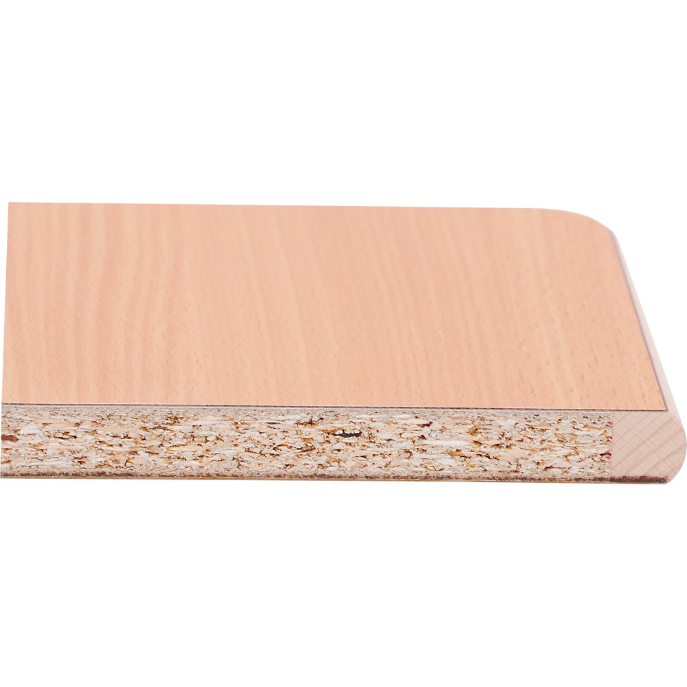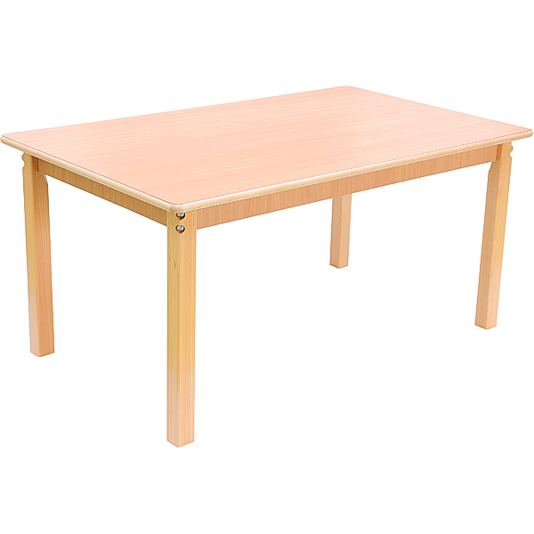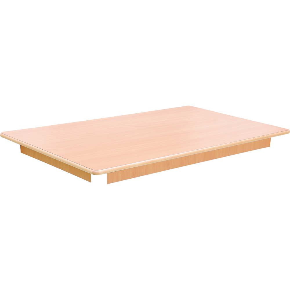Tischplatte aus HPL-beschichteter Spanplatte (18 mm) in Buche-Optik. Dieses Oberflächenmaterial ist extrem belastbar und wird bevorzugt für hoch beanspruchte Flächen im Möbelbau eingesetzt. Solche Tischplatte verträgt auch mal einen Stoss! Kanten aus Massivbuchenholz. Die Beschichtung ist über die Holzkante geleimt. So gibt es keine Fugen und Ritzen. Ein Ablösen der Kante ist ausgeschlossen. Abgerundete Ecken und Kanten sorgen für die Sicherheit der Kinder und verschönern gleichzeitig das Aussehen.