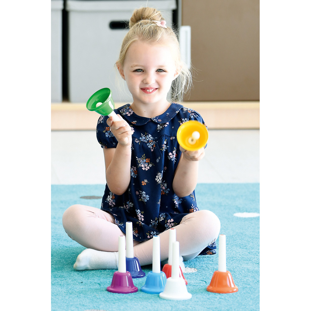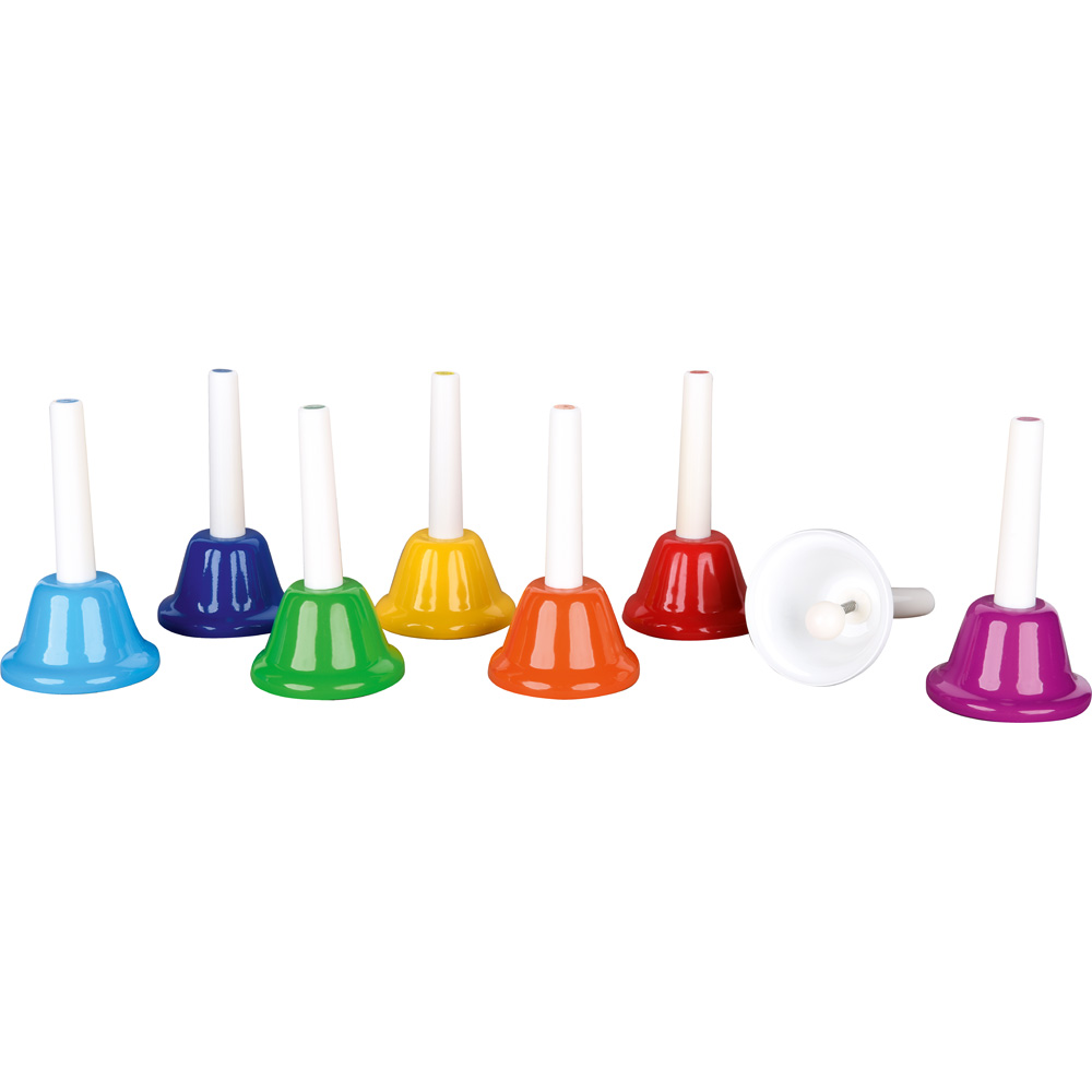 Metallglöckchenset mit Plastikgriffen. Jeder Ton in einer anderen Farbe; Tonumfang 1 Oktave.