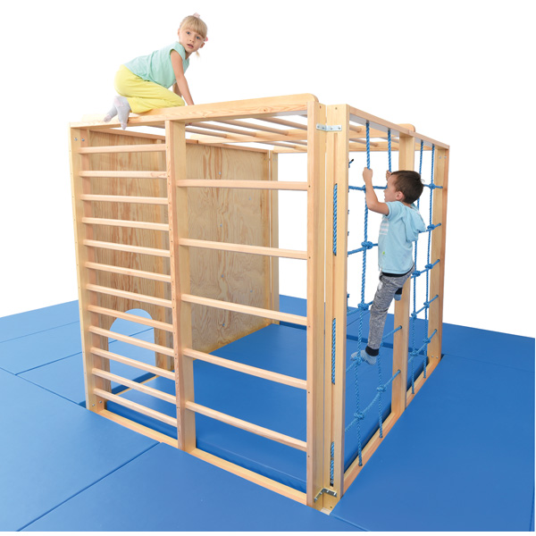 Holzkonstruktion mit Elementen für Bewegungsübungen. Hier können mehrere Kinder gleichzeitig turnen. Jede Wand bietet eine andere Klettermöglichkeit: Kletterwand, Leiter, Kletterseil mit Knoten und Kletternetz. Für sicheres Klettern muss die Kletteranlage am Boden befestigt werden. (Bodenbefestigung 026040 separat bestellbar.) Als Fallschutz um den Würfel herum empfehlen wir unsere Fallschutzmatten (101324, 101339 + 101326, 101341) oder die leichten Matten (101333, 101335 + 101334, 101336). Jeweils in 2 Farben erhältlich. Für den Innenbereich empfehlen wir die Matte 101127, deren Masse auf den Innenraum des Würfels abgestimmt sind.