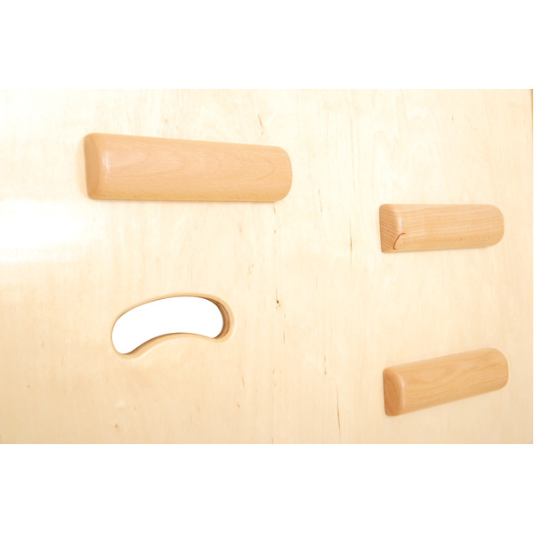 Diese Kletteranlagen sind besonders flexibel einsetzbar, da sie einfach in eine Sprossenwand eingehängt werden. Durch Einhängen auf verschiedenen Höhen lässt sich auch die Schräge und somit der Schwierigkeitsgrad ganz leicht variieren. Jede Anlage bietet andere Klettermöglichkeiten: Die Kletterwände lassen sich über Klettergriffe bzw. Fussstege kombiniert mit Eingriffsöffnungen erklimmen, am Kletternetz können sich kleine Kletteräffchen emporhangeln. Kletterwände aus stabilem Sperrholz (Stärke: 18 mm), Stärke der Seitenteile: 25 mm; Stärke des Kletternetzrahmens: 36 mm.