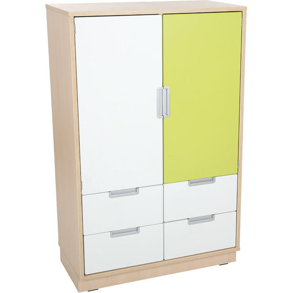 Für unsere neueste Kollektion verwenden wir laminierte Spanplatte in Ahorn-Dekor (Korpus) und weiss (Trennwände und Einlegeböden). Das natürliche Dekor kann mit Fronten aus farbig folierter MDF-Platte (Stärke 18 mm) ergänzt werden. Schubladen und Türen verfügen über Muschelgriffe, alufarben. • 092148 Schrank L mit 1 Trennwand und 2x2 Einlegeböden, B 79 - 1 Stck. • 092199 Einlegeböden - 2 Stck. - 1 Set • 092262 Schublade schmal - weiss - 4 Stck. • 095397 Tür mittelgross, 180° - weiss - 1 Stck. • 095401 Tür mittelgross, 180° - limone - 1 Stck. • Masse: B 79,2 x T 41,5 x H 124,2 cm
