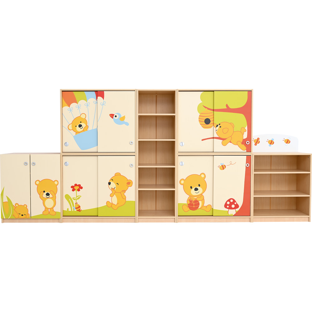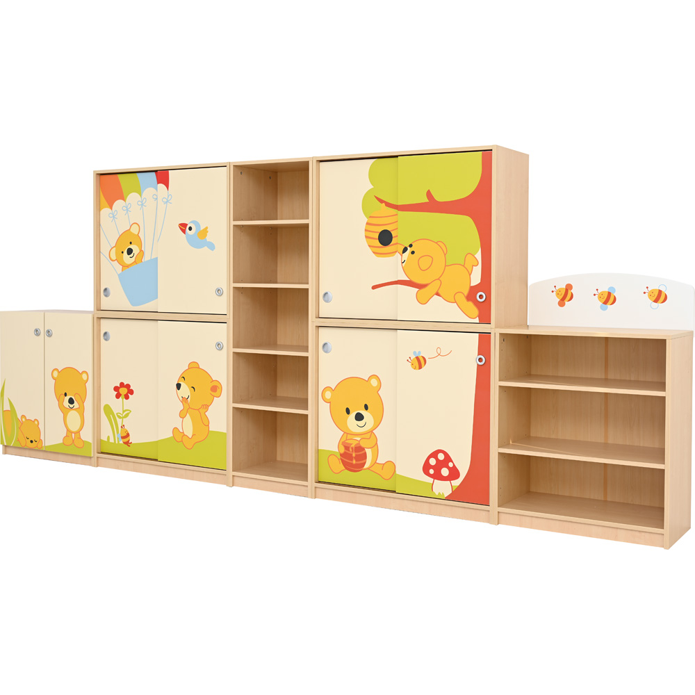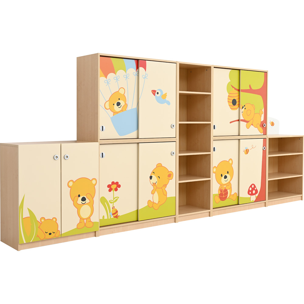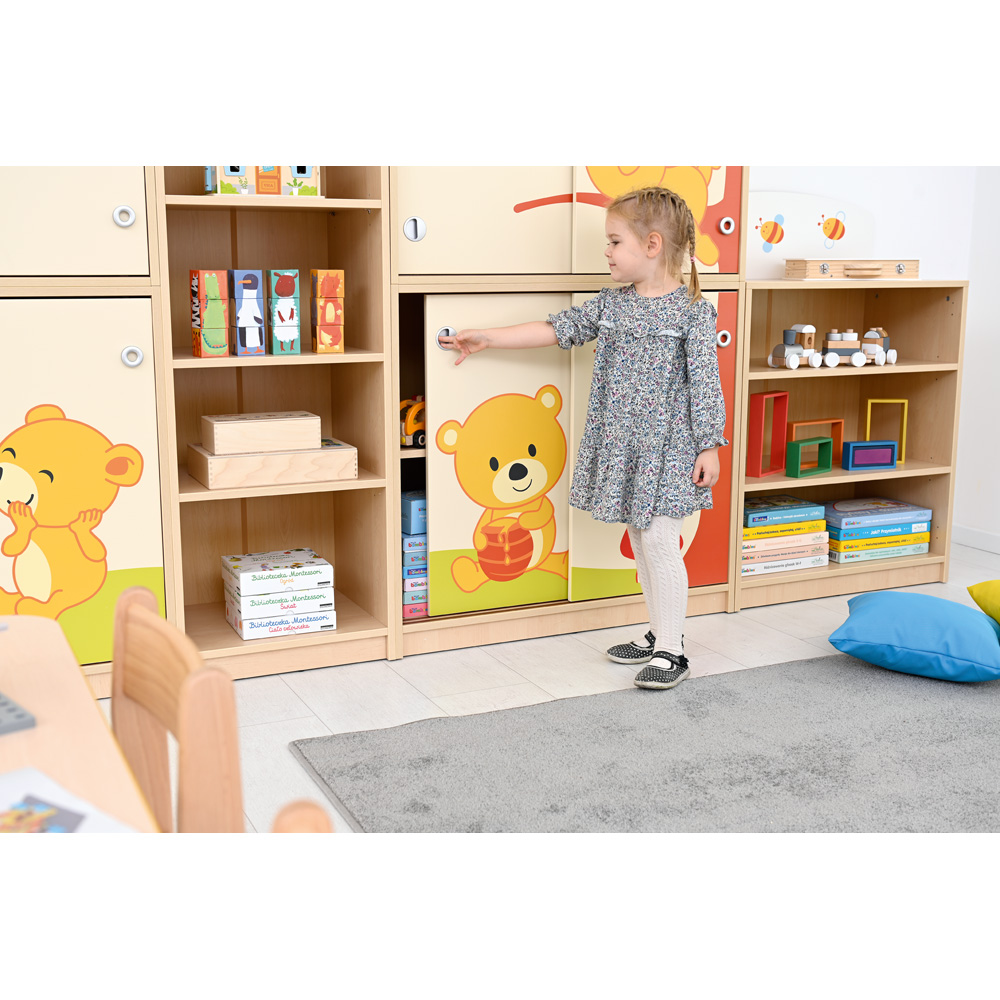 Die Möbelkollektion Phantasiewelt schafft eine freundliche Atmosphäre in Gruppenräumen. Ihre funktionalen Möbel bieten viel Raum zur Aufbewahrung von Lern- und Spielmaterialien, sowohl in den Schränken, als auch in den offenen Regalen. Die kinderfreundlichen phantasievollen Motive an den Schrankfronten stellen lustige Wald- und Haustiere dar. Schrankfronten aus laminierter MDF-Platte mit aufgedruckten Bildern, Korpus in Birke Dekor. Mit Schwenk- oder Schiebetüren. Die Schränke sind sowohl im Set, als auch einzeln erhältlich.