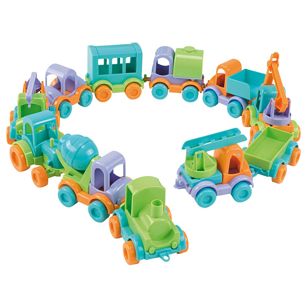 Klein, stabil, aus hochwertigem Kunststoff hergestellt; Fahrzeugtypen: Wagen, Traktor, Anhänger, Zisterne, Feuerwehrauto, Bagger, Kipper, Kran, Zementmischer, Lok, Waggon, Flugzeug, Hubschrauber und Rennwagen.