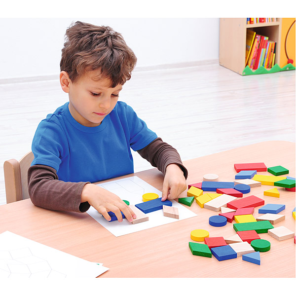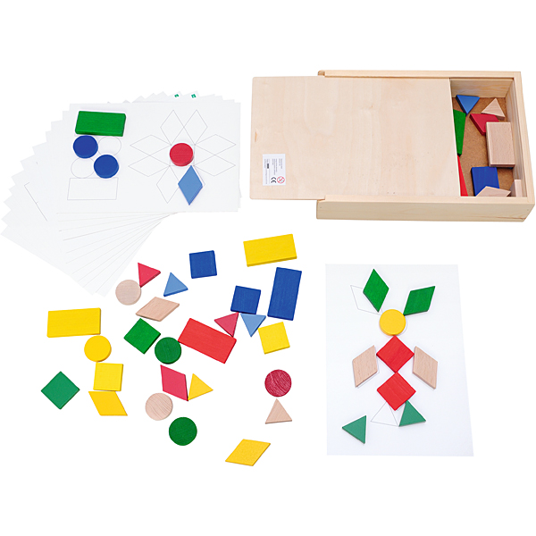 Holzpuzzle für Kinder; entwickelt die Vorstellungskraft, bringt das Benennen und das Erkennen von Farben und geometrischen Figuren bei.