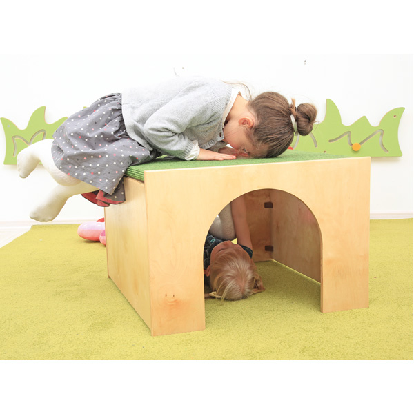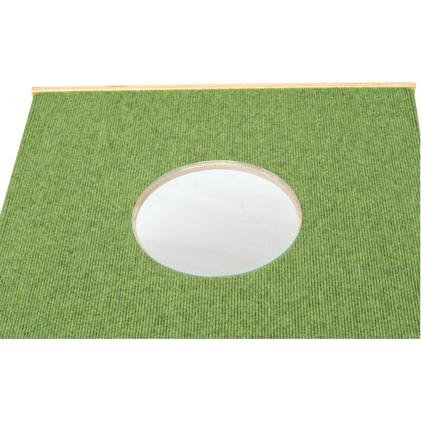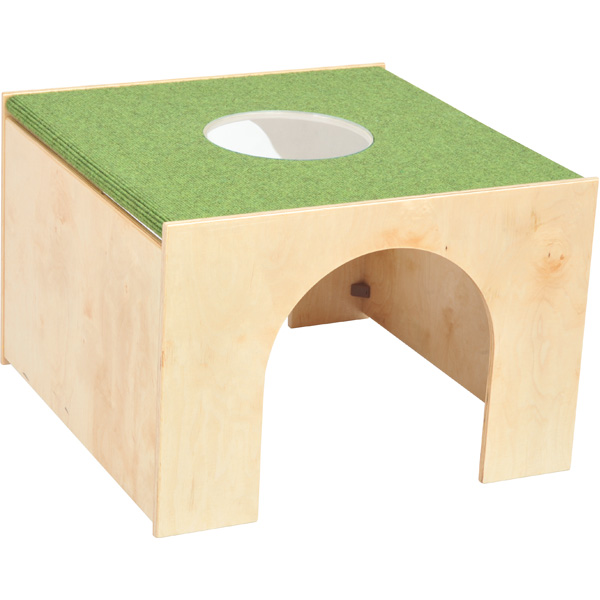 Podest mit begehbarem Glasfenster als Durchguck nach unten. An den Seiten gibt es Eingänge, so dass sich die Kinder verstecken können.