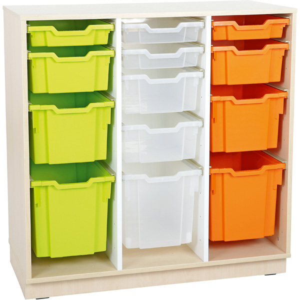 • aus laminierter Spanplatte (Stärke 18 mm) in Ahorn-Dekor (Korpus) und weiss (Trennwände)