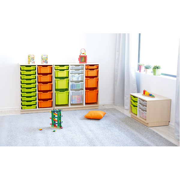 Die Quadro-Regale für Kunststoffbehälter, Tiefe 48 cm, sind in 3 Breiten (B 70 zweireihig, B 104 dreireihig, B 138 vierreihig) und diversen Höhen erhältlich. Die geräumigen Fächer können variabel mit Kunststoffbehältern verschiedener Höhen bestückt werden (372005-372026, 372034-372041, 372050-372073, separat bestellbar).