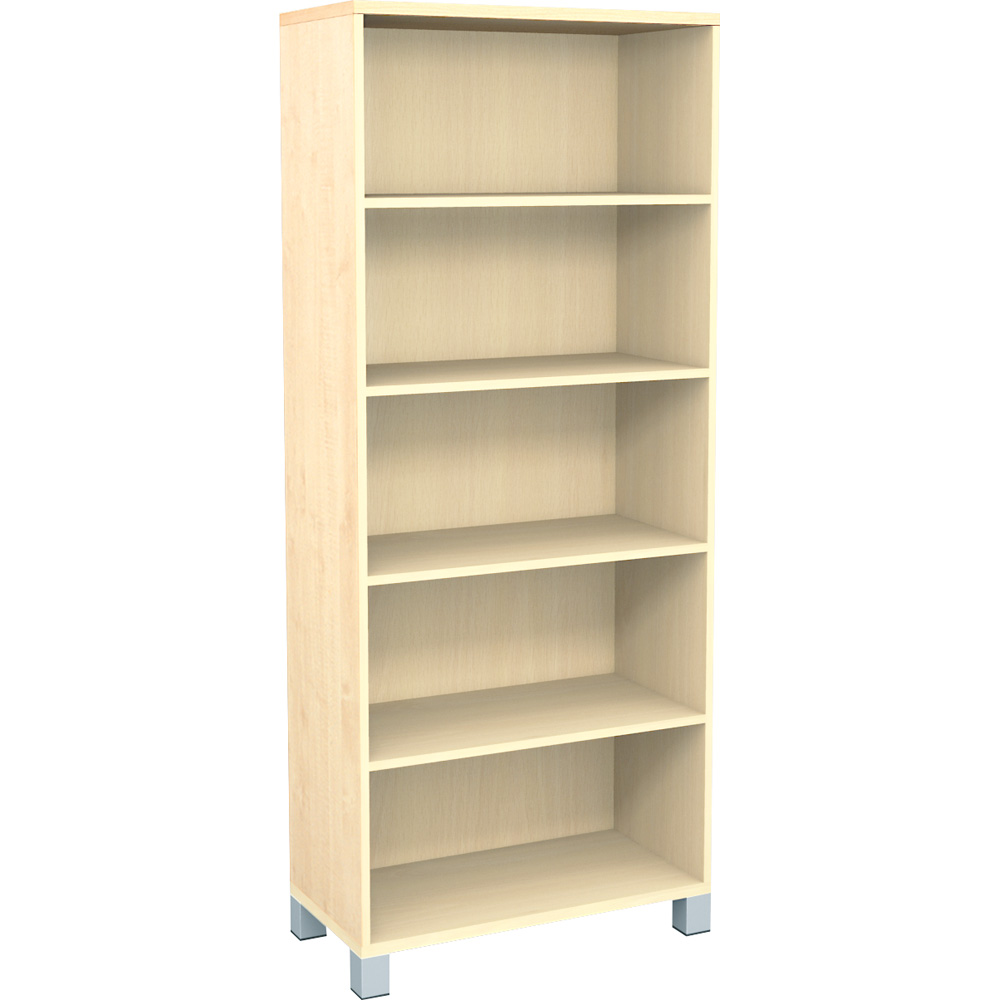 Aus laminierter Spanplatte in Ahorn-Optik (Korpuswände: 25 mm; Einlegeböden: 18 mm); mit stabilen, quadratischen Metallfüssen, stufenlos höhenjustierbar (bis 25 mm). Die Regale OPTO sind in unterschiedlichen Höhen lieferbar.