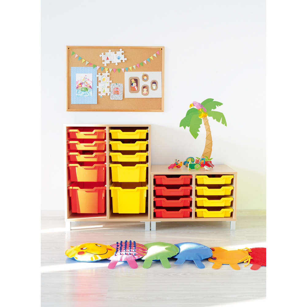 Kunststoffbehälter passend zu verschiedenen Schränken unserer Kollektionen Flexi, Quadro, Grande u.a.; Führungsschienen inbegriffen. Bruchsicher, formstabil und robust - ideal für den Alltag in Kita und Schule. Passendes Rollenset (372048) separat zu bestellen.