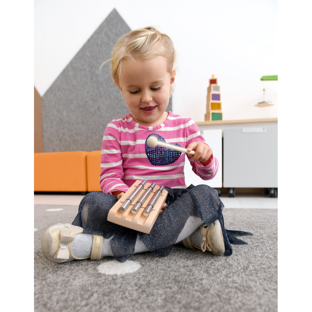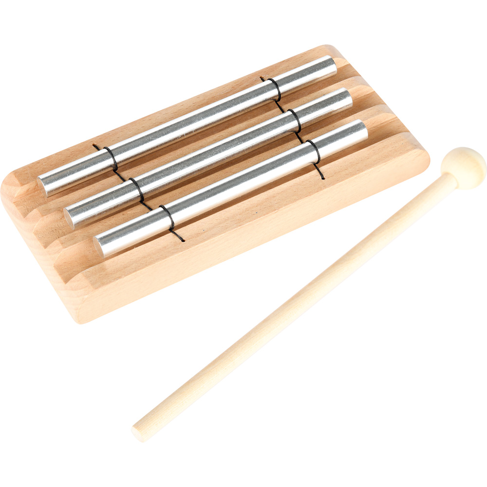 Aus Aluminium auf Holzstativ; mit Holzschlägel; erzeugt klare und ausdruckvolle Töne.
