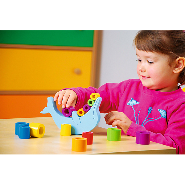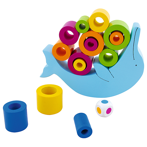 Es ist nicht so einfach, alle Teile auf dem Bauch des Schaukel-Delphins zu platzieren. Das Kind würfelt mit dem Farbwürfel und legt die Teile in dieser Reihenfolge auf. Wer es schafft, alle Elemente aufzulegen, ohne dass die Pyramide umfällt, der gewinnt. Schult Konzentration, strategisches Denken und Auge-Hand-Koordination.