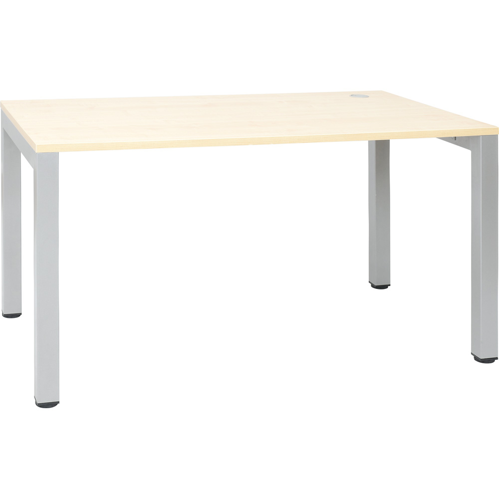 Stabiles, alufarbenes Metallgestell, Füsse stufenlos höhenjustierbar (bis 25 mm); Tischplatte aus laminierter Spanplatte (Stärke 25 mm) in Ahorn-Optik, mit PVC-Kanten (Stärke 2 mm); mit Kabeldurchführung und Kabeltunnel an der Unterseite der Tischplatte.
