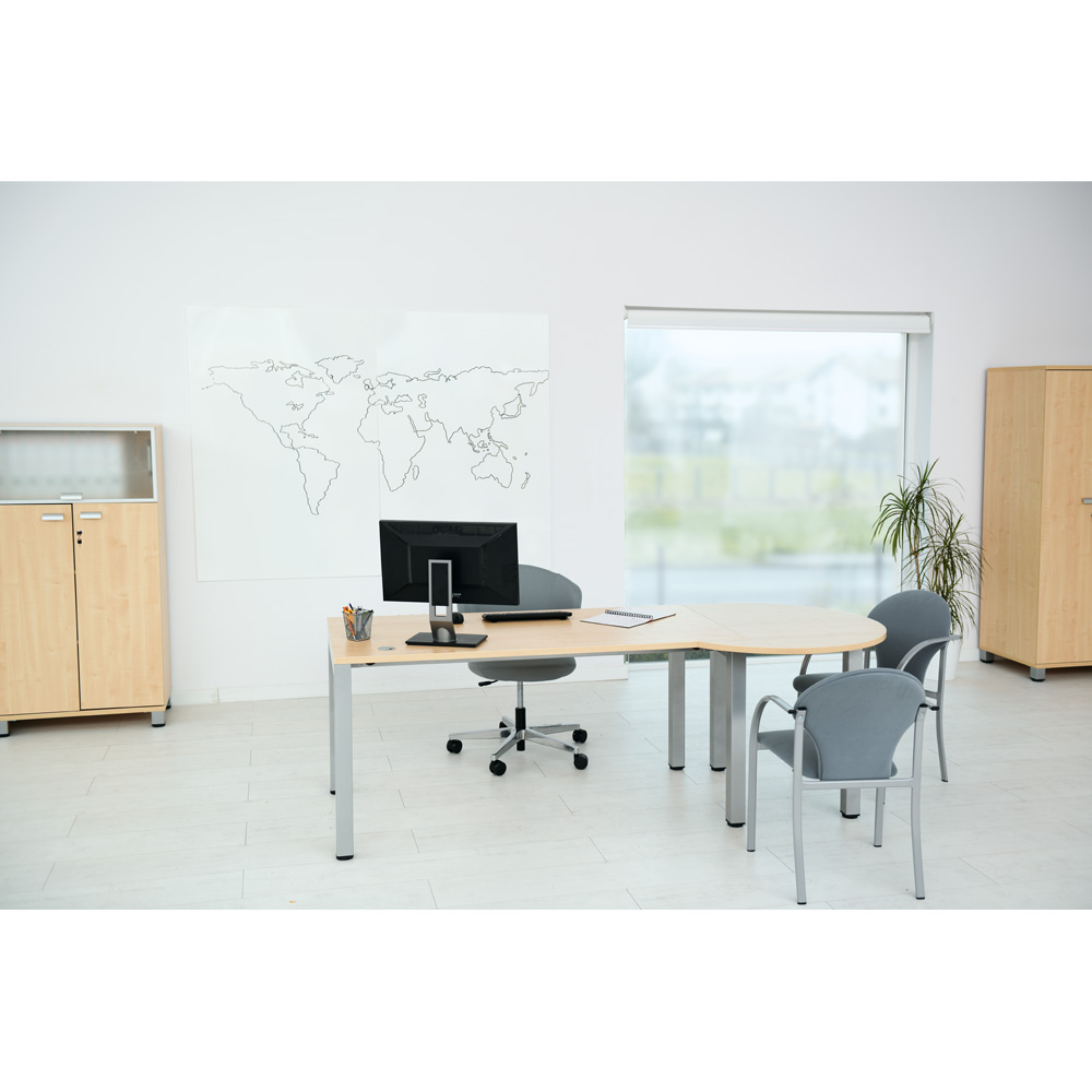 Stabiles, alufarbenes Metallgestell, Füsse stufenlos höhenjustierbar (bis 25 mm); Tischplatte aus laminierter Spanplatte (Stärke 25 mm) in Ahorn-Optik, mit PVC-Kanten (Stärke 2 mm); mit Kabeldurchführung und Kabeltunnel an der Unterseite der Tischplatte.