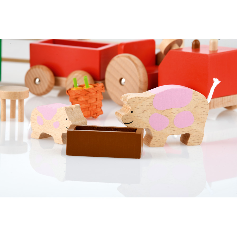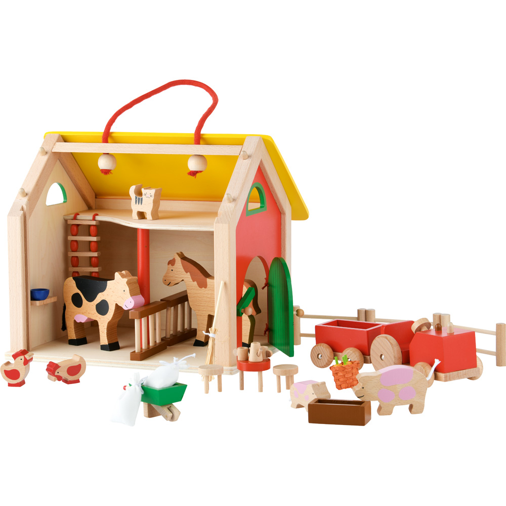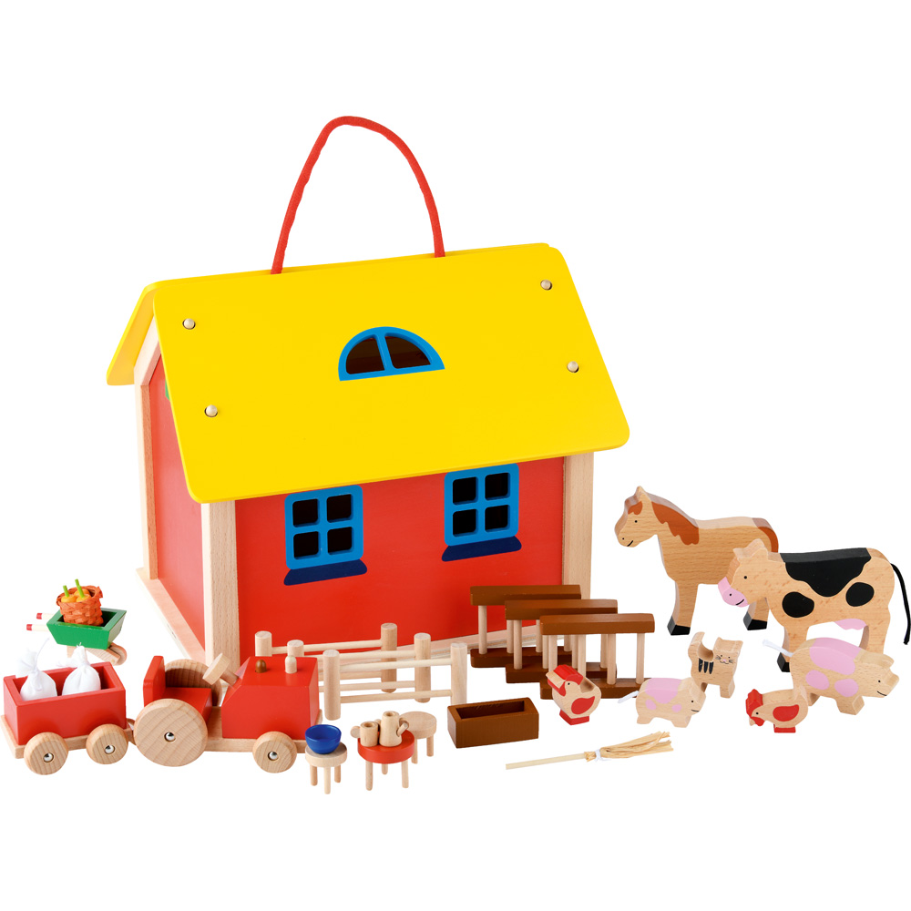 Aus lackiertem Holz; Bewohner: Kuh, Pferd, 2 Schweine, 2 Hähne, Katze; Ausrüstung: Traktor, Schubkarre, Tierfutter, Tisch mit Stühlen.