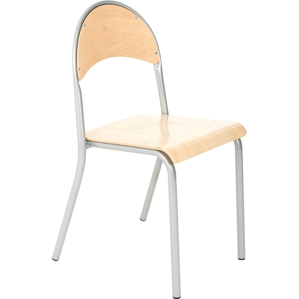 Gestell der P-Stühle aus rundem Metallrohr (Ø 18 mm bei Stuhlgrösse 1-2, Ø 22 mm bei Stuhlgrösse 3-4 und Ø 25 mm bei Stuhlgrösse 5-7). Sitzfläche und Rückenlehne aus lackiertem Buche-Sperrholz (Stärke: 6 mm bei Stuhlgrösse 1-4, 8 mm bei Stuhlgrösse 5-7). Bequeme, leicht gerundete Rückenlehne bietet hohen Komfort. Profilierte Sitzfläche mindert beim Sitzen den Druck auf die Kniekehle. Die weit nach hinten ausgestellten Stuhlbeine sorgen für hohe Standsicherheit. Die Stühle sind platzsparend stapelbar (bis max. 8 Stck.). Zum Schutz des Fussbodens haben die Stuhlbeine Fusskappen. Die Produktion erfolgt gemäss DIN-EN 1729.