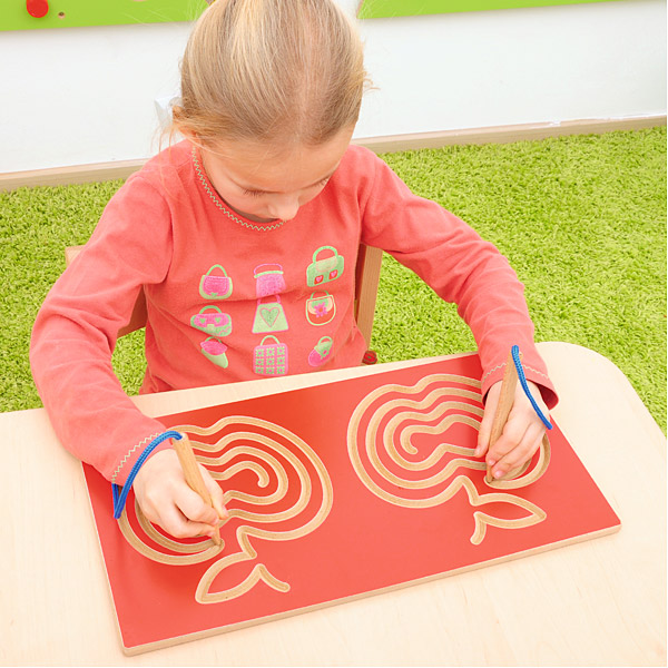 Tafeln mit zwei symmetrischen Labyrinthen zum Üben mit beiden Händen gleichzeitig. Ein hervorragendes Hilfsmittel für die Therapie von Kindern mit Lese-Rechtschreib-Schwäche. Die Übungen verbessern die notwendige Feinmotorik für die Schreibhaltung der Hand. Gleichzeitig werden räumliche Orientierung, Aufmerksamkeit, Wahrnehmung und Auge-Hand-Koordination verbessert.