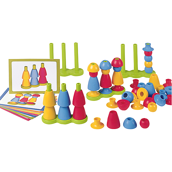 Bunte Elemente, die auf Stifte gesteckt werden. 4 Formen in 3 Farben bieten viele Kombinationsmöglichkeiten. Ein Stapelspiel, das die Fingerfertigkeit schult, die räumliche Vorstellungskraft entwickelt und beim Erlernen von Farb- und Formennamen hilft. Aus Kunststoff.