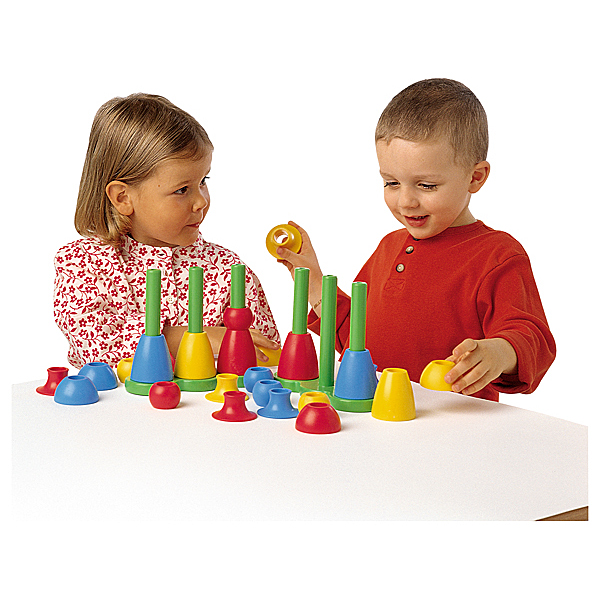 Bunte Elemente, die auf Stifte gesteckt werden. 4 Formen in 3 Farben bieten viele Kombinationsmöglichkeiten. Ein Stapelspiel, das die Fingerfertigkeit schult, die räumliche Vorstellungskraft entwickelt und beim Erlernen von Farb- und Formennamen hilft. Aus Kunststoff.