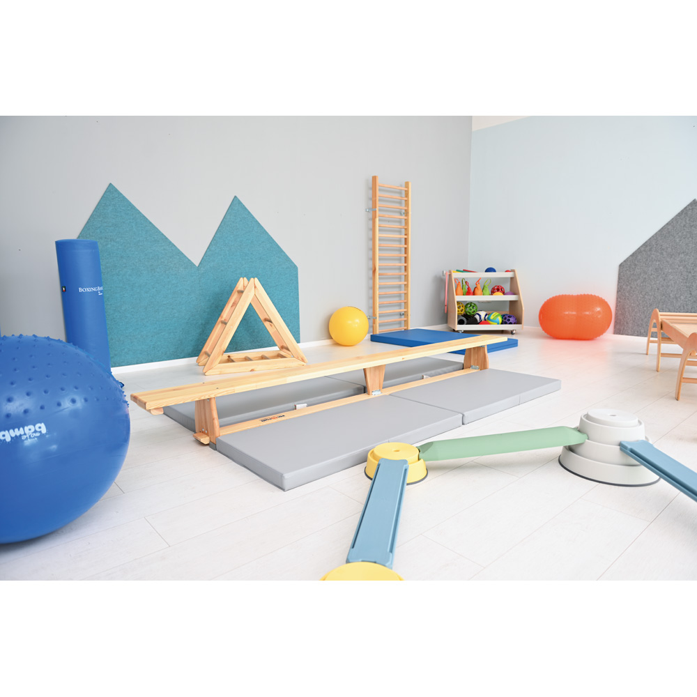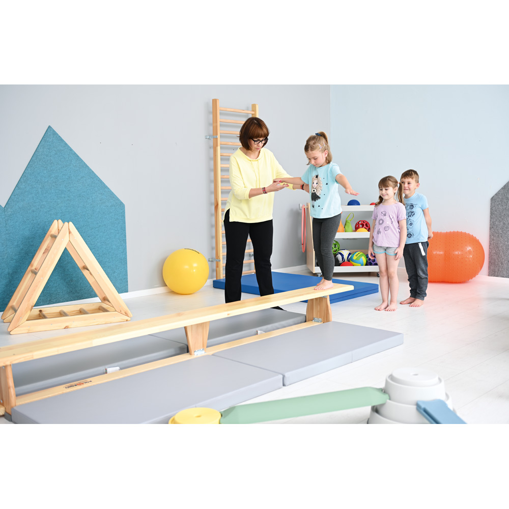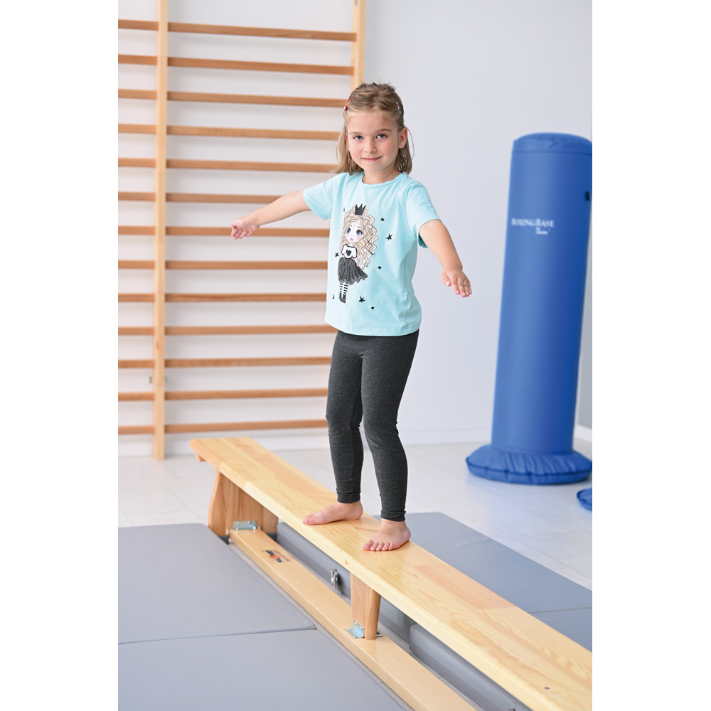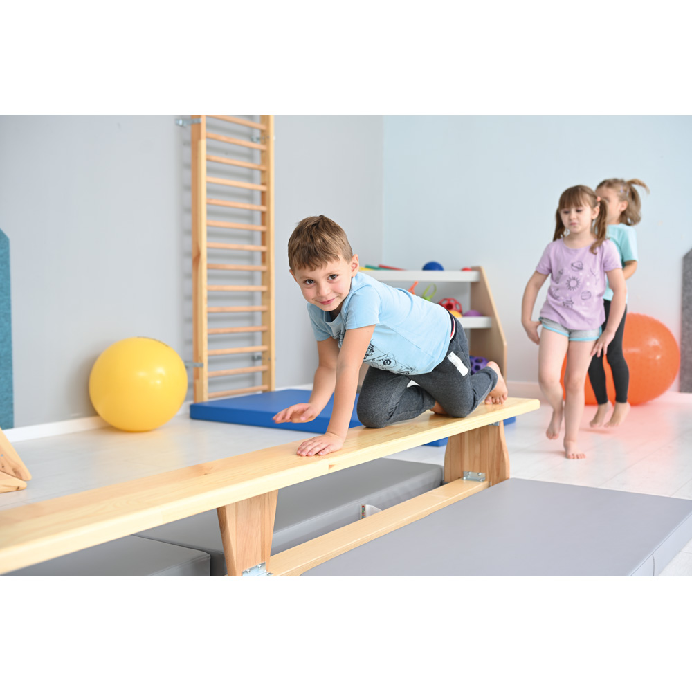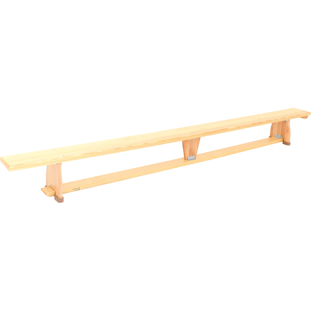 Holzbank mit Gummi-Bodenschonern, vielseitig einsetzbar. Verzinkte Stahlprofile an Verbindungselementen sorgen für Stabilität und Sicherheit; alle Kanten sind abgerundet. Mit Halterung zum Einhängen an Sprossenwand oder Turnkasten. Wenn man die Bank umdreht, entsteht ein Schwebebalken von 10 cm Breite.