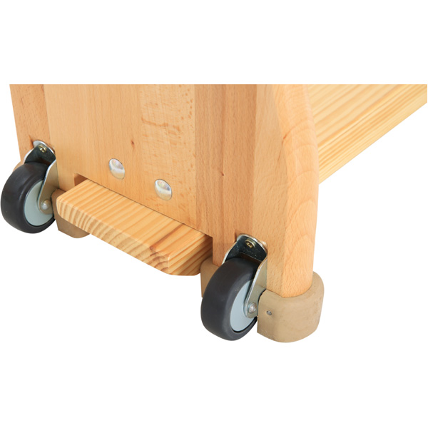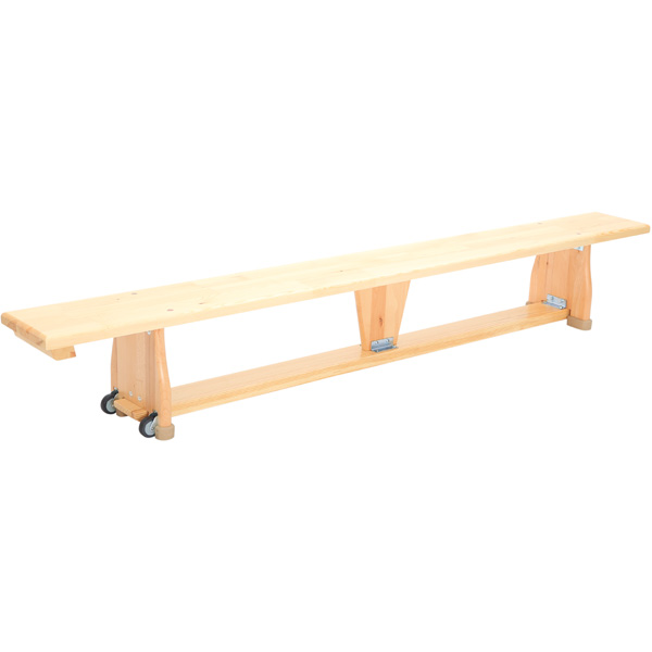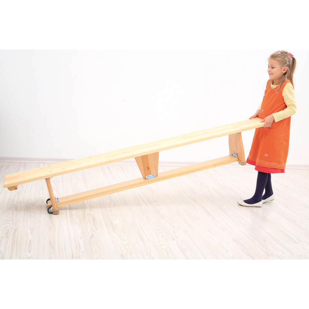Turnbank aus Holz mit Gummi-Bodenschonern, die keine Abriebspuren hinterlassen. Der Transport wird durch zwei Rollen erleichtert. Stahlprofile an Verbindungselementen sorgen für Stabilität und Sicherheit. Abgerundete Ecken und Kanten minimieren die Verletzungsgefahr. Umgedreht wird die Bank zum 10 cm schmalen Balancierbalken.