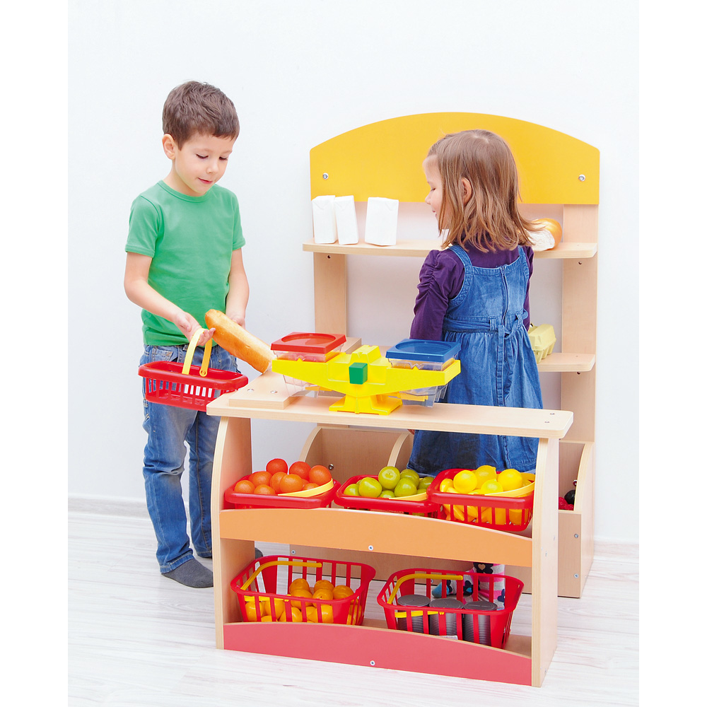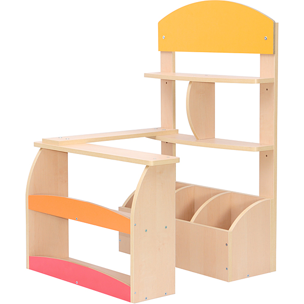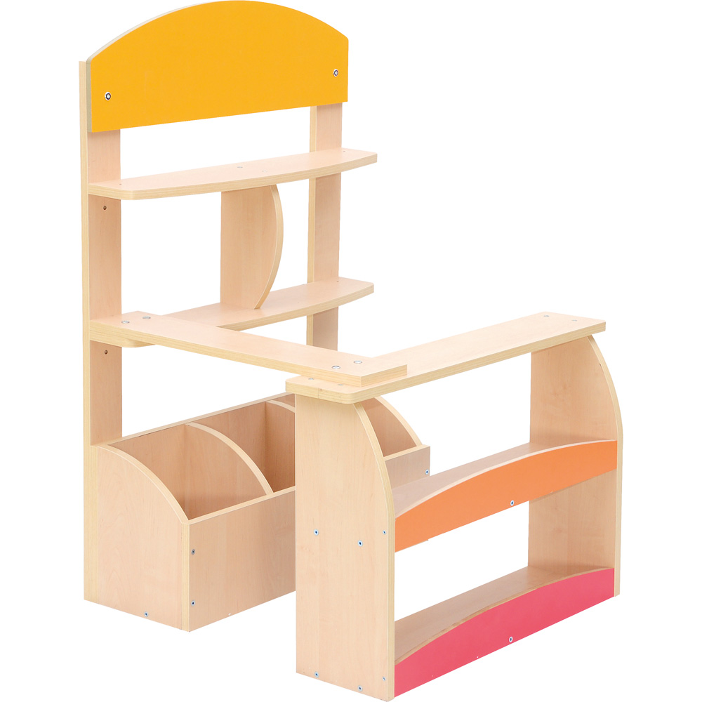 Kombination aus Spanplatte (Ahorn-Optik) mit farbiger MDF-Platte; Rückwand und Verkaufstisch mit verschieden grossen Fächern.