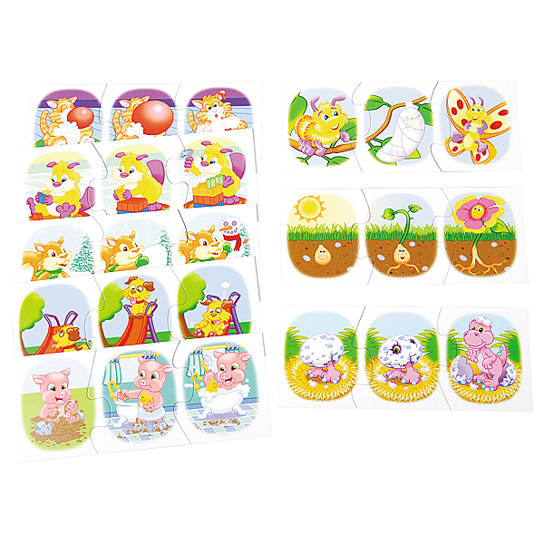 14 Geschichten zum Zusammensetzen und Erzählen. Zu jeder Szene passen 3 Bilder, die in richtiger Reihenfolge zusammengelegt werden. Nur logisch gewählte Bausteine passen zusammen, so kann das Kind sich selbst kontrollieren. Entwickelt den Beobachtungssinn und das logische Denken; geeignet für den Fremdsprachenunterricht. • 14 x 3 Puzzle-Teile aus Karton • Masse nach dem Zusammenlegen: 23 x 10,5 cm • ab 3 Jahren