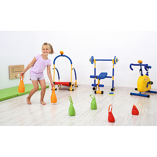6 farbige Säckchen für Gleichgewichts- und Kraftübungen. Robuster, pflegeleichter Kunstlederbezug, gefüllt mit Granulat.