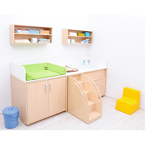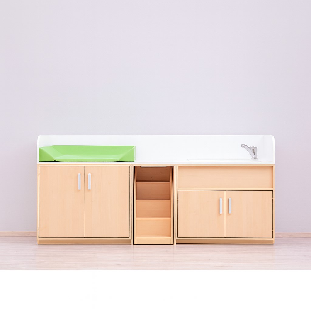 Wickelkommodenlandschaft 2 besteht aus Wickelkommode mit 2 Türen, Treppe, Badewannen- oder Waschbeckenschrank mit Waschbecken und durchgehender Arbeitsplatte; inklusive Armatur und Wickelauflage. Die auf dem Foto abgebildeten Hängeregale sind im Preis nicht enthalten.