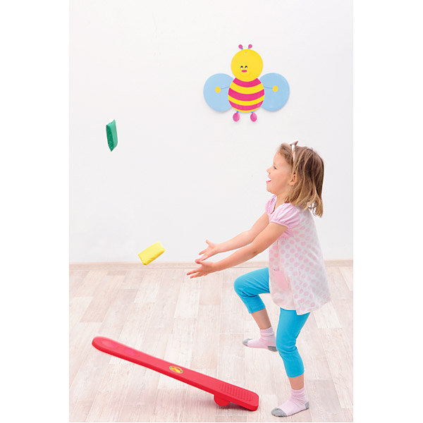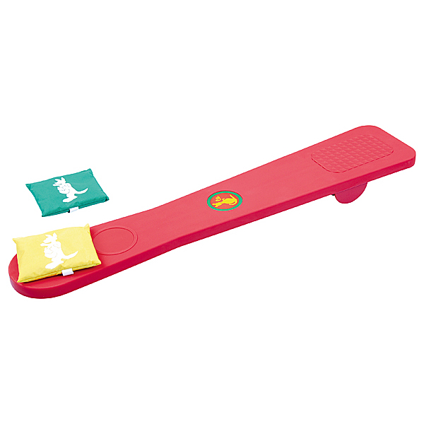 Ein einfaches Wurfbrett aus Kunststoff für Bewegungsübungen, Entwicklung von Auge-Hand-Koordination und Reaktionsfähigkeit. Wenn das Brett auf einer Seite betreten wird, schleudert das Säckchen am anderen Ende nach oben.