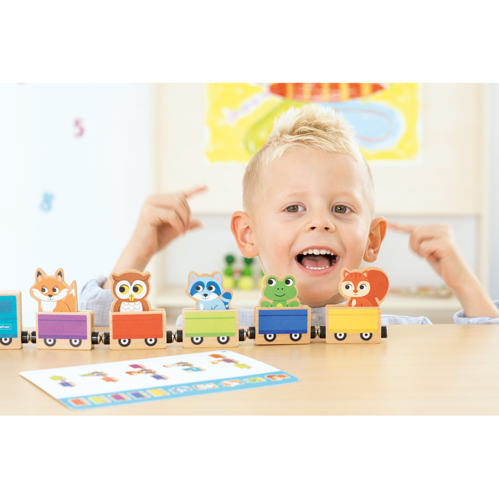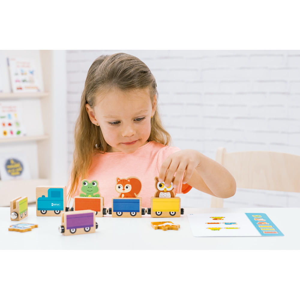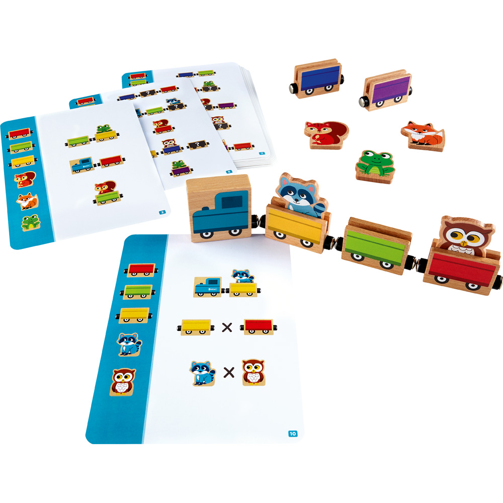 12 tierisch-lustige Legeaufgaben, die Aufmerksamkeit, logisches Denken und räumliches Vorstellungsvermögen trainieren. Aufgabe des Kindes ist es, einen Zug aus Waggons in der richtigen Reihenfolge zusammenzusetzen und die Tiere an ihren richtigen Platz zu setzen. Ist das geschafft, findet sich auf der Rückseite der Aufgabenkarte die richtige Lösung zum Vergleichen.