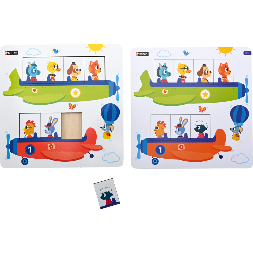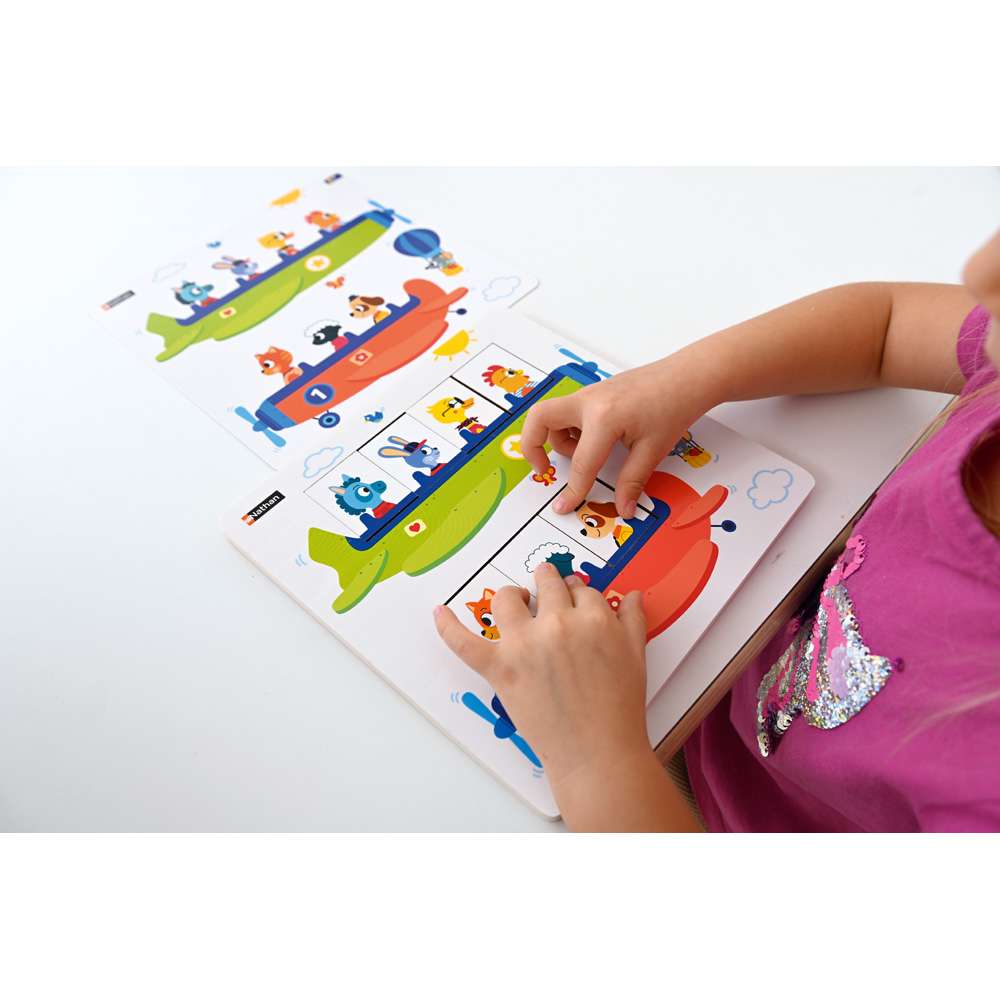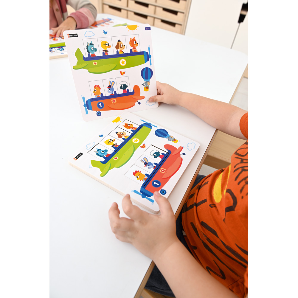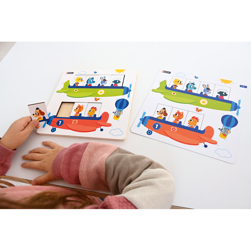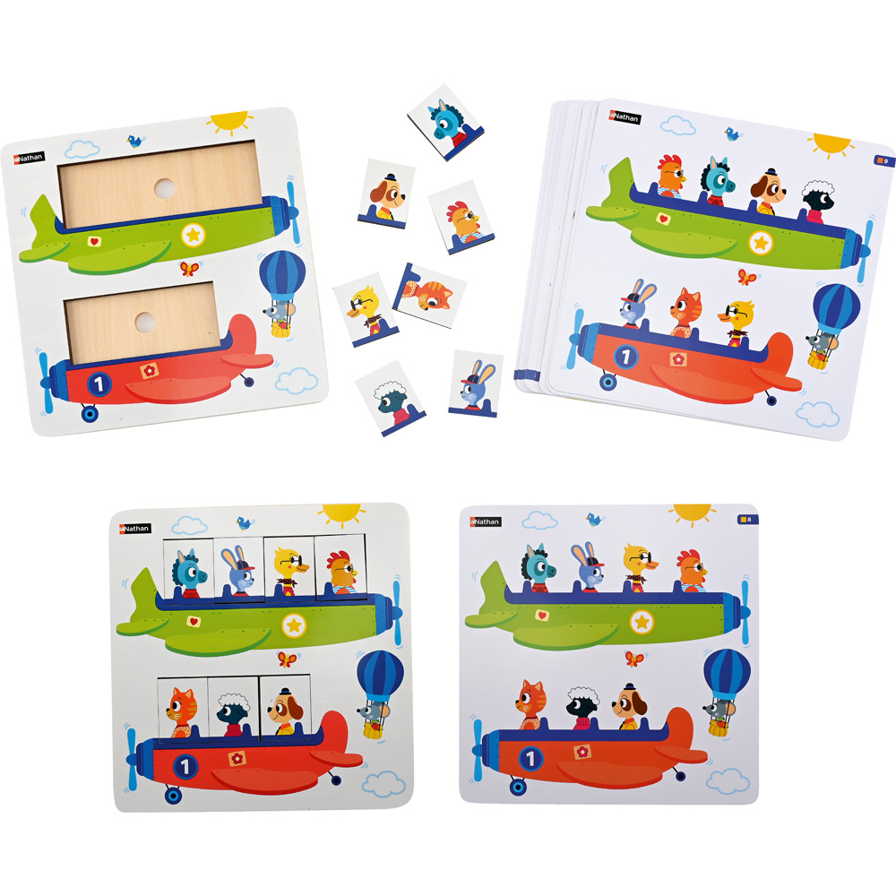 Ein Legespiel, das die räumliche Orientierung und das logische Denken entwickelt. Ziel des Spiels ist es, alle Tiere an Bord der beiden Flugzeuge zu bringen. Die Kinder eignen sich das Vokabular von Anordnung und relativer Position an: vor, hinter, zwischen, zuerst, erster, zweiter. Die 12 doppelseitigen Aufgabenarten bilden 6 Serien mit steigendem Schwierigkeitsgrad.