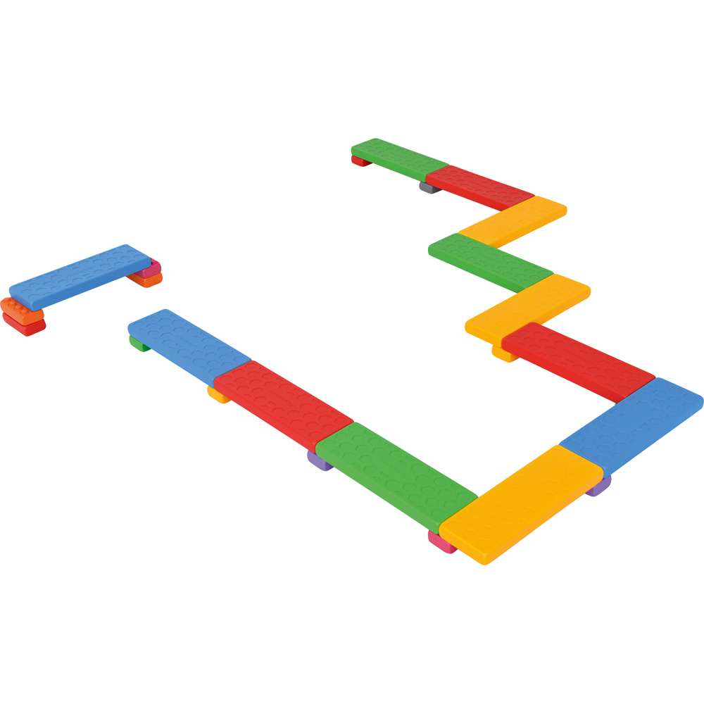 Eine Balancierstrecke, die aus Bausteinen beliebig zusammengebaut werden kann. Kleinere Bausteine bilden die Ständer. Die grösseren Plattformen dienen als Pfad. Die Plattformen haben eine wabenförmige Struktur.