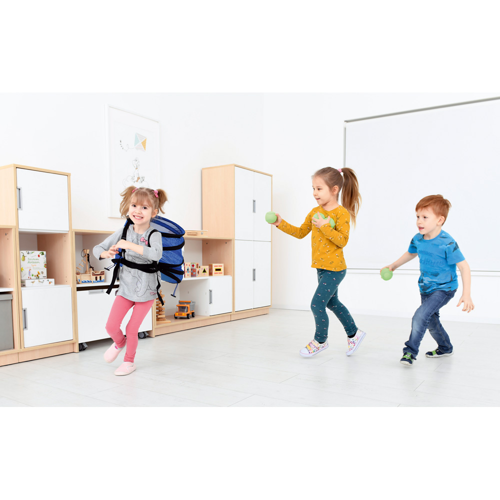 Ein Spiel, das Teamarbeit fördert. Beim Kooperationsspiel teilen sich die Kinder in zwei Gruppen auf und jede muss die Bälle so schnell wie möglich in ihren mobilen Korb befördern. Im Wettkampfspiel muss jedes Team alle seine Bälle in den mobilen Korb des gegnerischen Teams werfen. Das Kind, das den Korb auf dem Rücken hat, läuft von seinen Gegnern weg.
