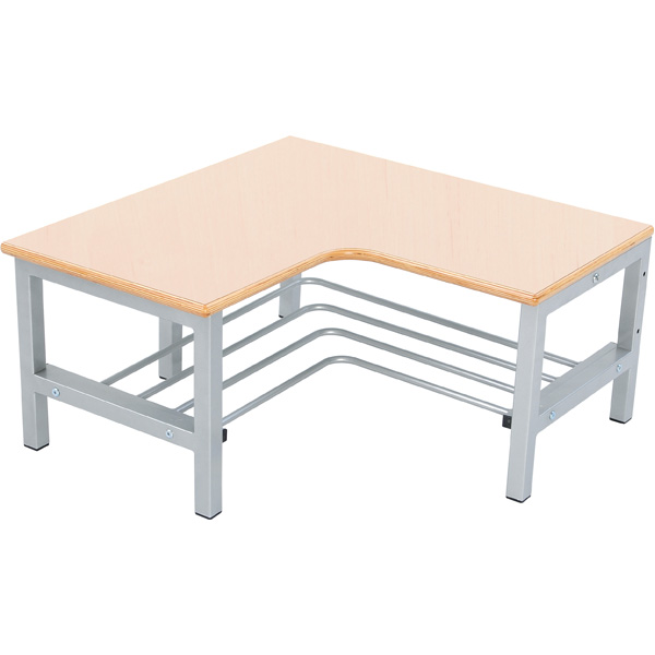 Ecksitzbank aus farbigem HPL-laminiertem Sperrholz (Stärke: 19 mm); Schuhablage mit Gitterrost. Passend zum Regal 092546.