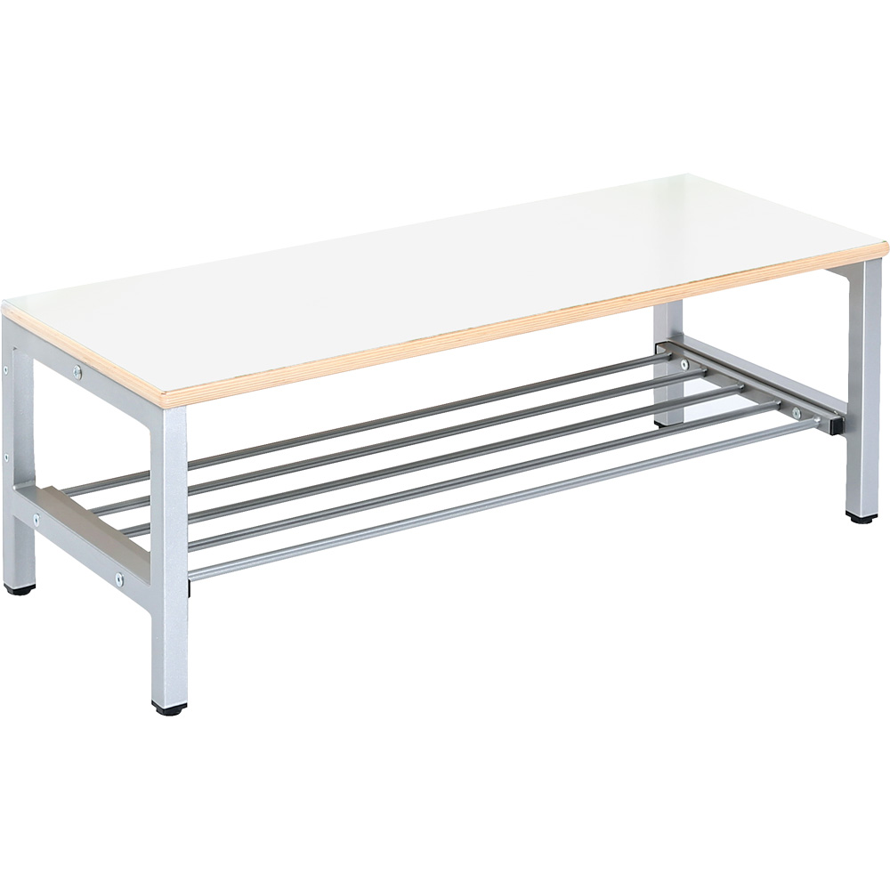 Sitzbank aus farbigem HPL-laminiertem Sperrholz (Stärke: 19 mm); Schuhablage mit Gitterrost. Passend zum Regal 092984.