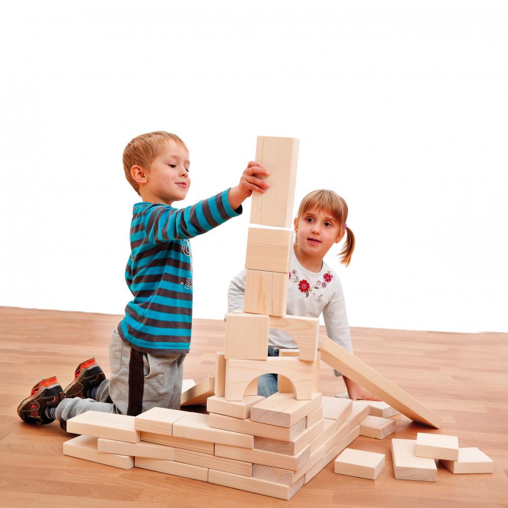• 41 Bausteine aus Massivholz inklusive 2 Riegel und 3 Brücken
